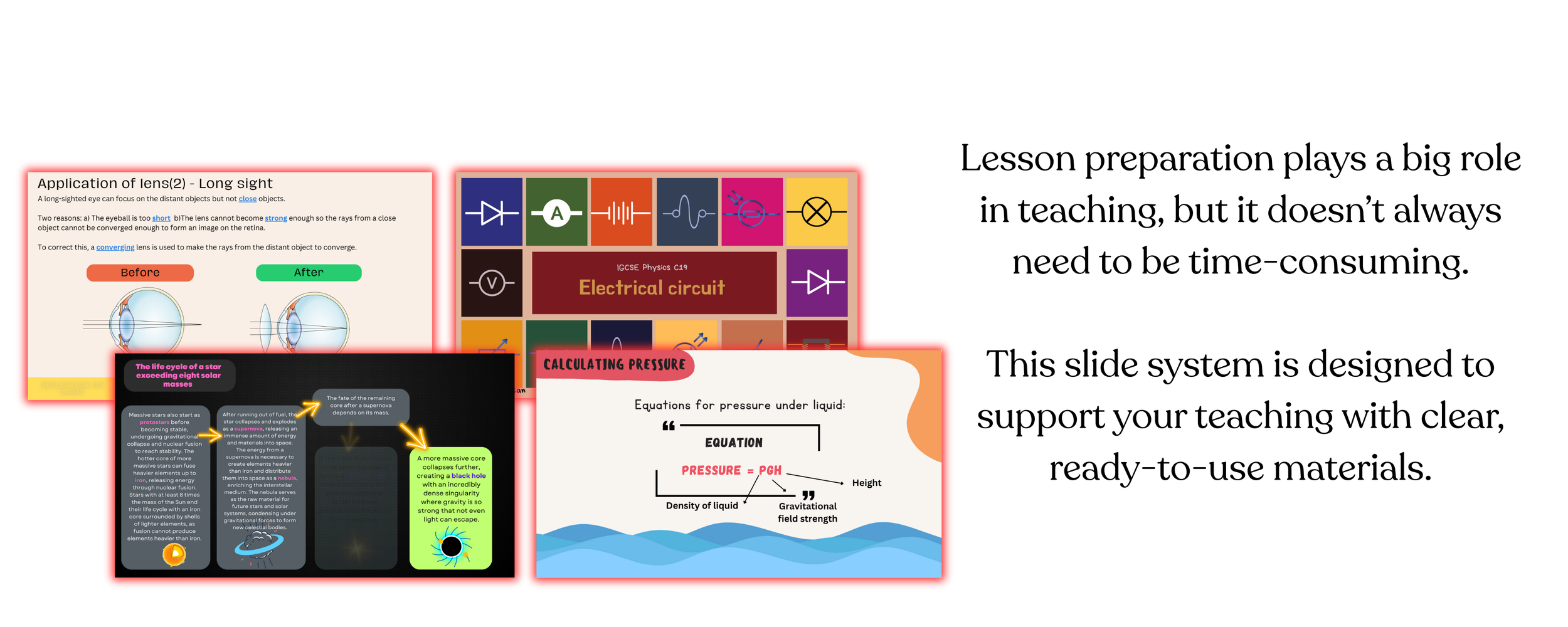 A complete, ready-to-use slide system for teaching IGCSE Physics, designed to help teachers teach with clarity and confidence.