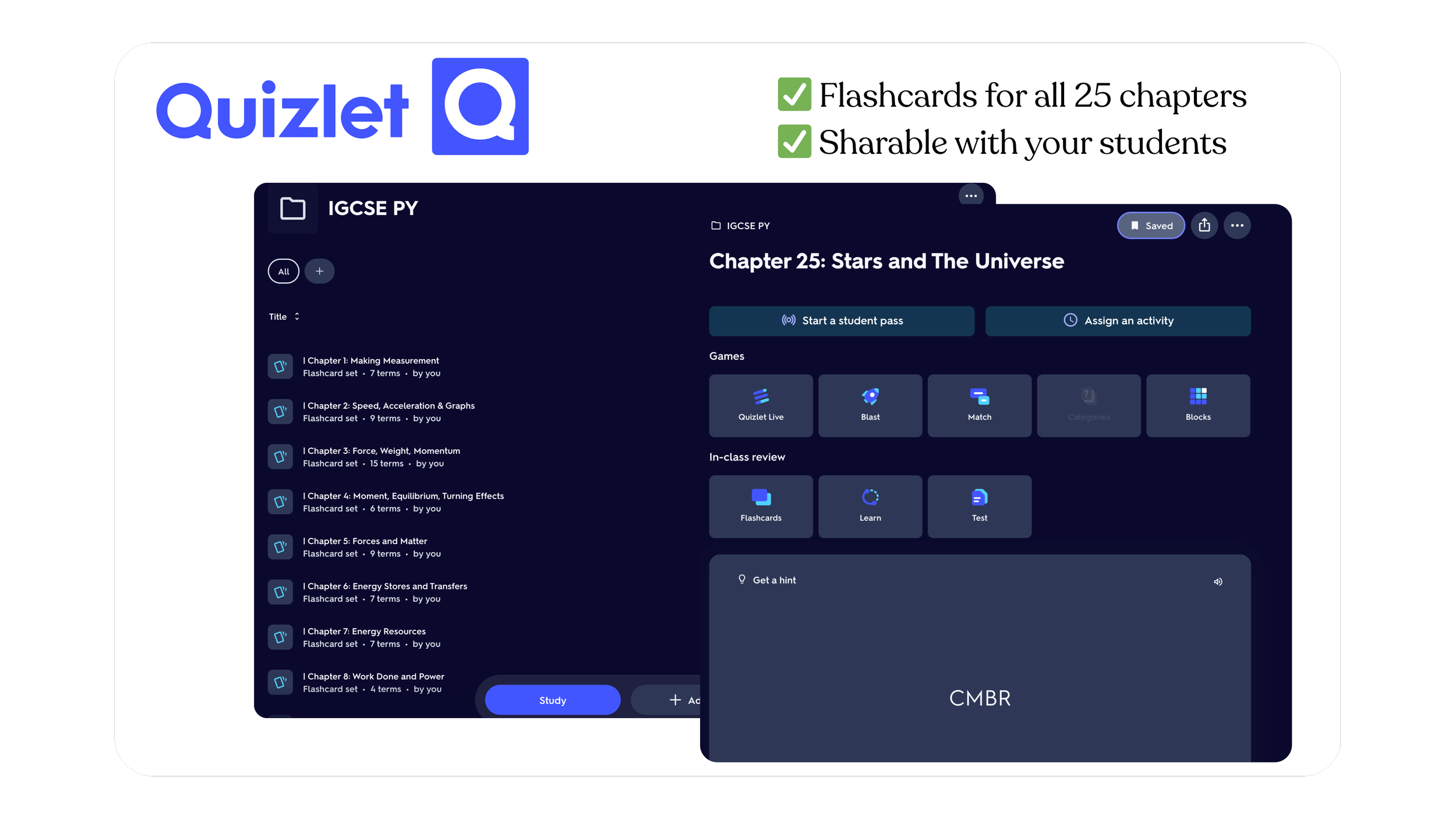 For every chapter, youโll get access to Quizlet flashcards, organised clearly by topic. You can share the link directly with your students, allowing them to test themselves immediately using flashcards, matching, or quick review modes โ with no setup required on your end.